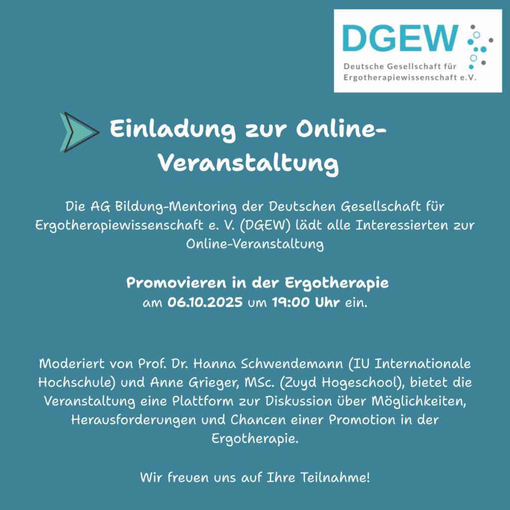 Das diesjährige Forschungssymposium wird vom DGEW-Vorstand zusammen mit den Arbeitsgruppen Bildung-Mentoring für die Promotion und Leitlinien/Evidenzbasierte Praxis ausgerichtet. Unabhängig davon, ob Sie Praktiker:in, Lehrende:r, Wissenschaftler:in mit oder ohne DGEW-Mitgliedschaft sind, sind Sie herzlich eingeladen, an dieser Veranstaltung teilzunehmen. Weitere Informationen zum DGEW-Symposium und das konkrete Programm finden hier: DGEW Symposium 2025 – Deutsche Gesellschaft für Ergotherapiewissenschaft e.V.